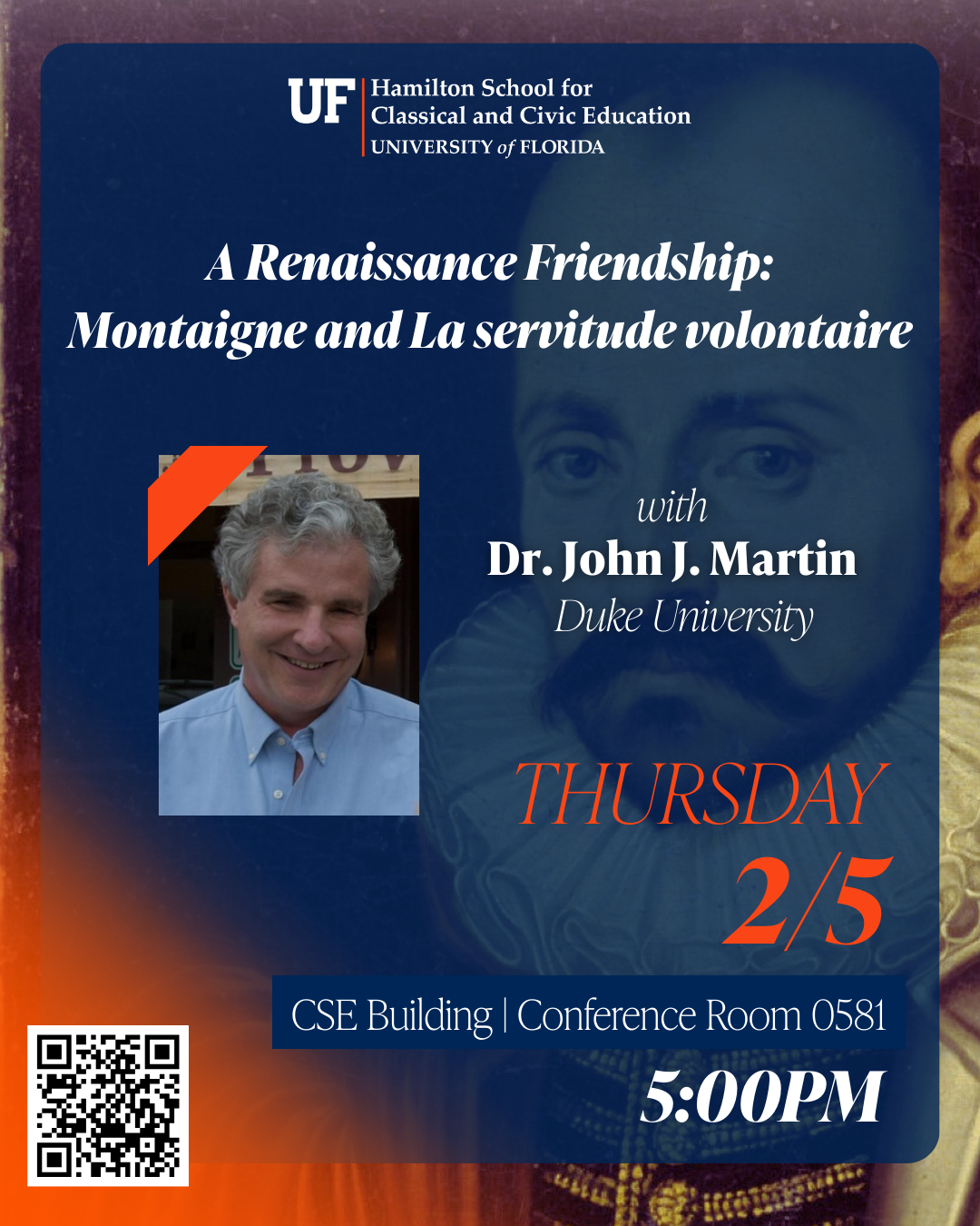 Dr. John J. Martin of Duke University, a leading historian of early modern Europe, will explore the intellectual friendship between Michel de Montaigne and Étienne de La Boétie, fo…